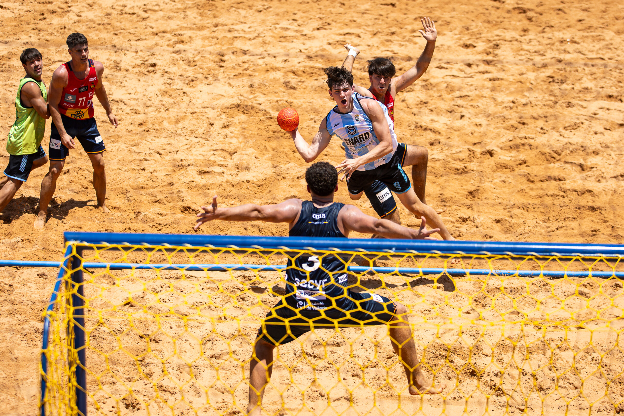En el segundo set, paridad absoluta hasta el 16 iguales a cuatro minutos del final. Un tanto de Ezequiel Rozitchner -goledor nacional con 10 puntos- ilusionó estirar a los shoot-out, pero falló varios ataques y España se lo quedó 24:20. Ya en el último turno, en un mano a mano por el pase a la final ante Brasil, la Selección protagonizó una verdadera batalla definida en los shoot-out. Un comienzo de primer set ilusionante con un parcial 4:0 que luego tendría un baño de realidad con un parcial 0:10 que le significó a los locales llevarse con margen el set 22:16.